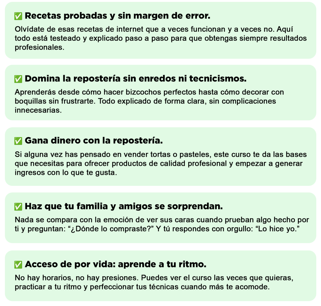 En este curso te enseñamos exactamente eso. No más pruebas y errores frustrantes. Aprenderás las bases y las técnicas probadas que usamos los profesionales, explicadas de forma simple y clara, para que cada torta y pastel que hagas salga perfecto.